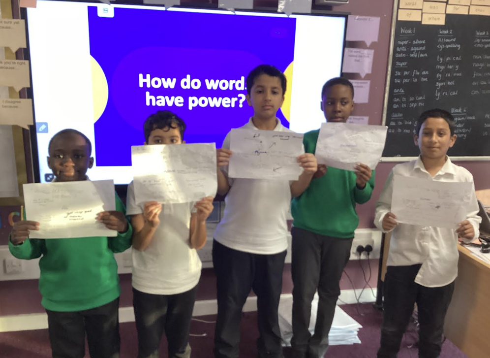 Indigo base photos are from a refugee workshop that we enjoyed with the British Library. We practised showing a variety of emotions in our faces and actions as freeze frames, learned how we could create a freeze frame of a scenario using different levels within the group (standing, crouching, sitting, etc) to make the frame more effective and realistic. Our freeze frames were based on the story of 'Azzizi in between' by Sarah Garland. This workshop helped to enhance our empathy with refugees and the horrific circumstances they often find themselves in. This links really well with our English learning this term where we have written a persuasive letter to the prime minister in support of refugees and we are planning to write a journey tale about refugees. All our work in class has been focussed on our reading of a novel 'The Boy at the Back of the Class' by Onjali Q Rauf, which tells the story of a refugee called Ahmet, which the children are thoroughly engrossed in.