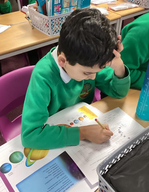 In science, we were exploring the concept of day and night. The children used a torch to represent the light source of the sun and placed a small lego character on a globe to represent the Earth rotating as it orbits the sun. Children explored the way the planets orbit the sun using a moving model to gain knowledge of the solar system.