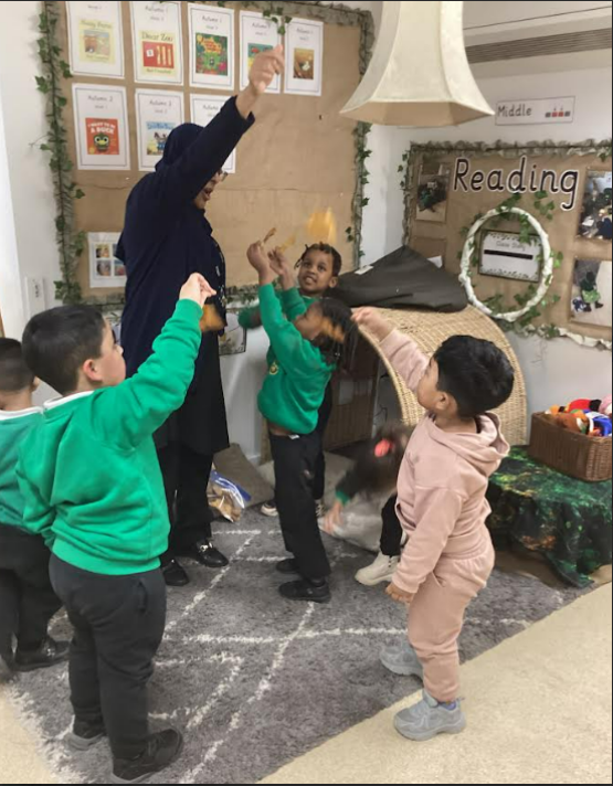 This term we have been busy exploring the magic of Autumn. The children loved going outdoors to collect colourful leaves, noticing their different shapes and colours, and talking about how they had fallen from the trees. Back inside, we gathered together to enjoy stories about Autumn and learn our Autumn song 'Autumn Leaves are Falling Down'!