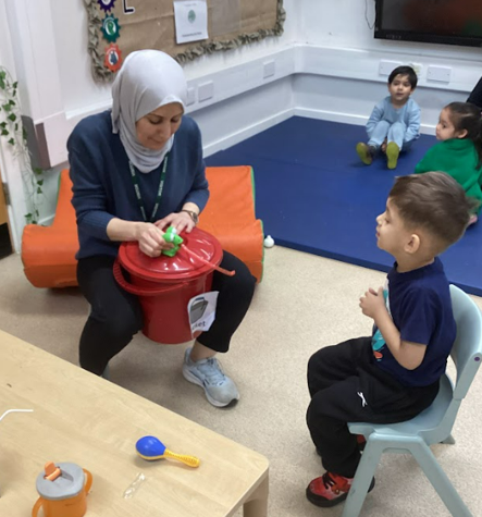 One of the exciting activities we use is the Attention Bucket. This is a structured session designed to build children’s attention and listening skills. A bucket filled with interesting and surprising objects is used to capture curiosity. Adults model focused attention by presenting each item in an exciting way, whilst children learn to watch, listen and share enjoyment.