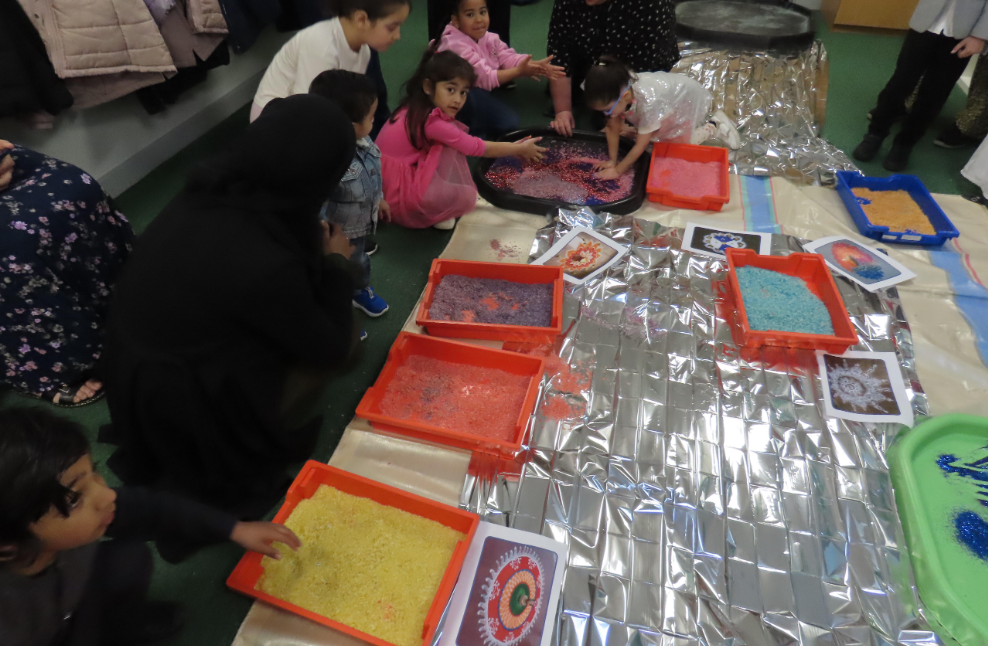 This Friday we had a Family Friday celebration with the theme of 'All about us'. Last half term we created a fact file all about ourselves, including: where we were born and where our families come from, the language/s we speak, the food we eat and much more. We had a range of cultural activities such as creating Rangoli patters using coloured rice, making Romanian bracelets, writing about their homes with their family members and even having Mendhi applied by some of our very talented parents and family members.