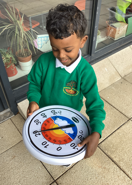 In Science this week we have been carrying out an investigation; we placed a water gauge in our Orange base area to discover how much water would fall. Together we measured the guage and discovered it had collected 8cm of water! We have also been keeping a weather diary, we have a thermometer outside of our classrooms and have been checking the temperature every morning!