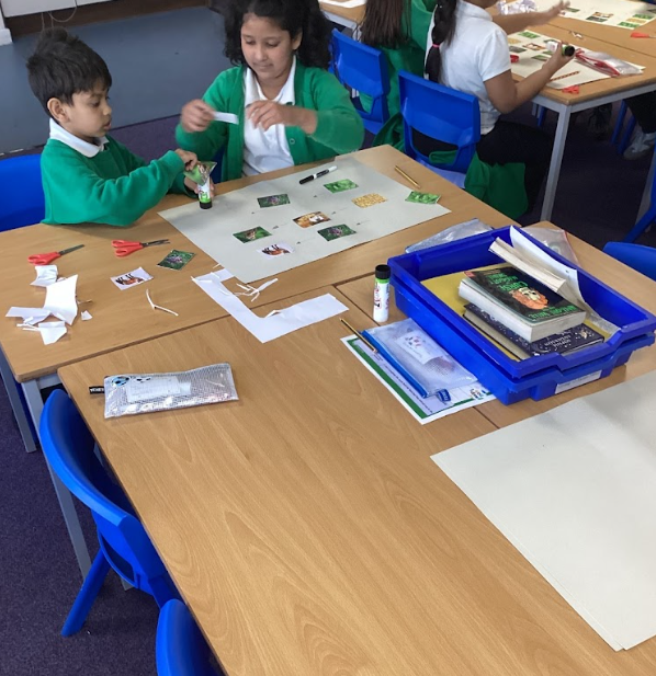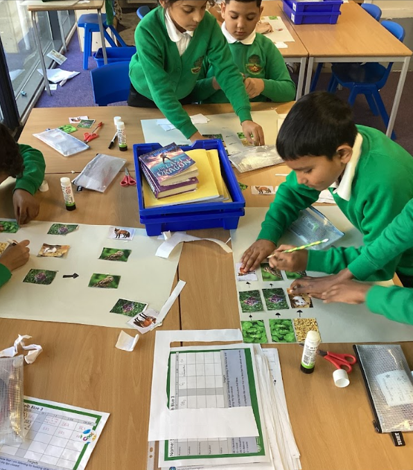Then the children have begun further investigation into food chains. Their tasks are to construct and interpret food chains, focusing on identifying producers, predators, and prey within a given habitat – you can see below the children talking and enjoying discussions about this subject.