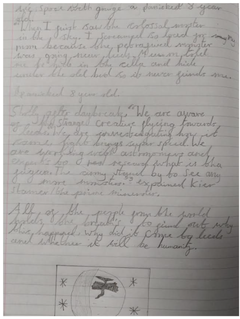 This week in Blue Base, we have been writing our Hot Tasks! Based on the story of The Iron Man by Ted Hughes, our job was to write a newspaper article based on Chapter 5. The book takes an unexpected turn, when a space-bat-angel-dragon draws closer and closer to earth and finally lands on Australia demanding to be fed! The children have been practising writing summarising sentences, time adverbials, enticing descriptions in their quotes from onlookers and finally, extra information that informs the reader.