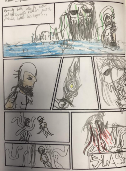 Blue base have been exploring Anglo- Saxons in their history topic and their writing around the legend of Beowulf. To add to this, we have been learning about the artist Gareth Hinds, who illustrates graphic novels. His depiction of battle scenes and monsters are very exciting! We have been practising our own techniques, zooming in, zooming out and creating tension in our cartoon illustrations. The children have shown great talent!