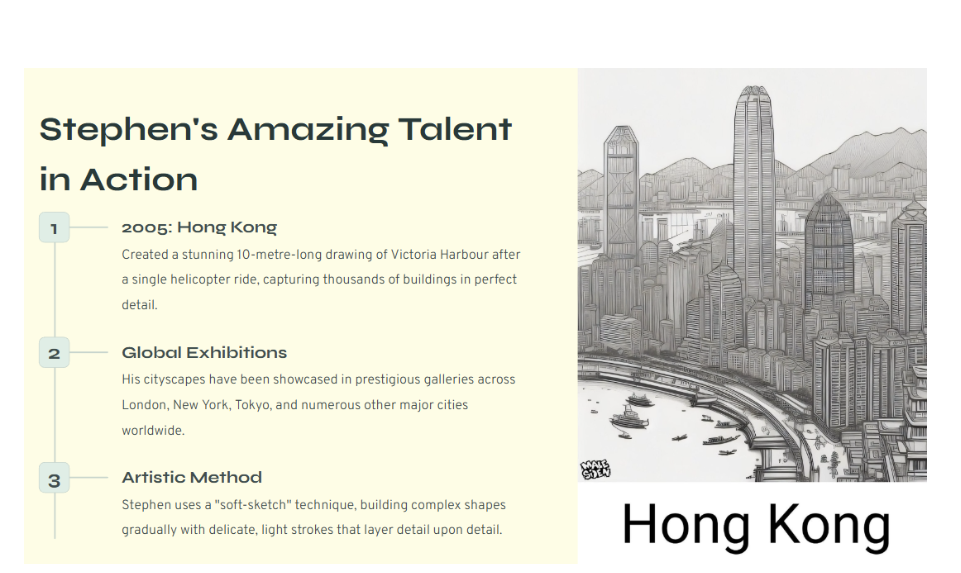 The work itself has been inspired by the artist Steven Wiltshire. He is a British architectural artist and savant known as the ‘human camera’ for his ability to recall entire city skylines after brief views, like in a helicopter ride, and recreate them with stunning accuracy and detail. Drawing has been his primary mode of expression and communication since childhood.