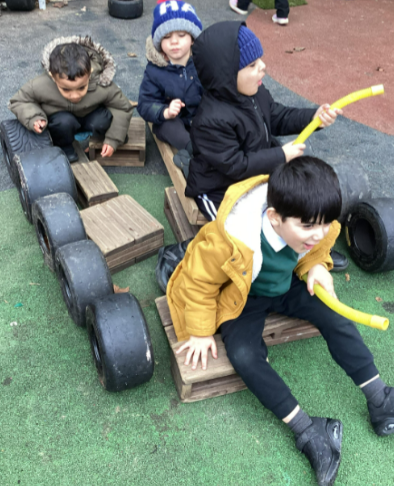 Nursery Rhymes are sung at multiple points in the day in our Nursery. A group of children here are singing the rhyme 'Wheels on the Bus'. This led to a whole afternoon of building buses, making tickets and discussing where we were heading on our bus.