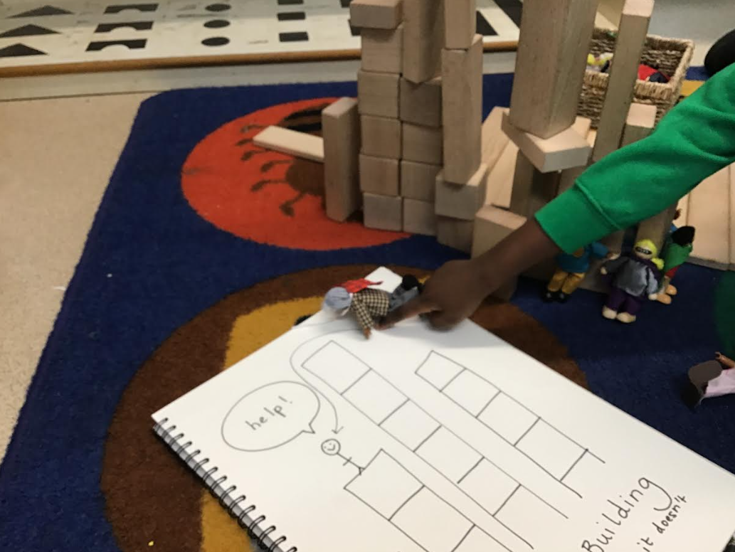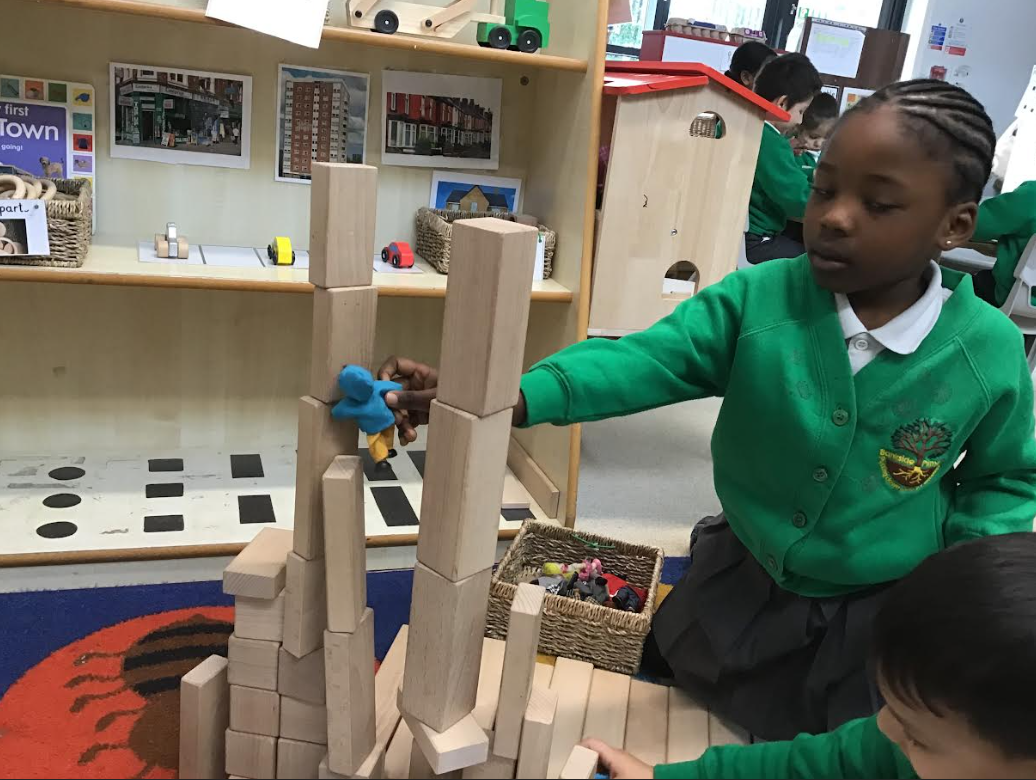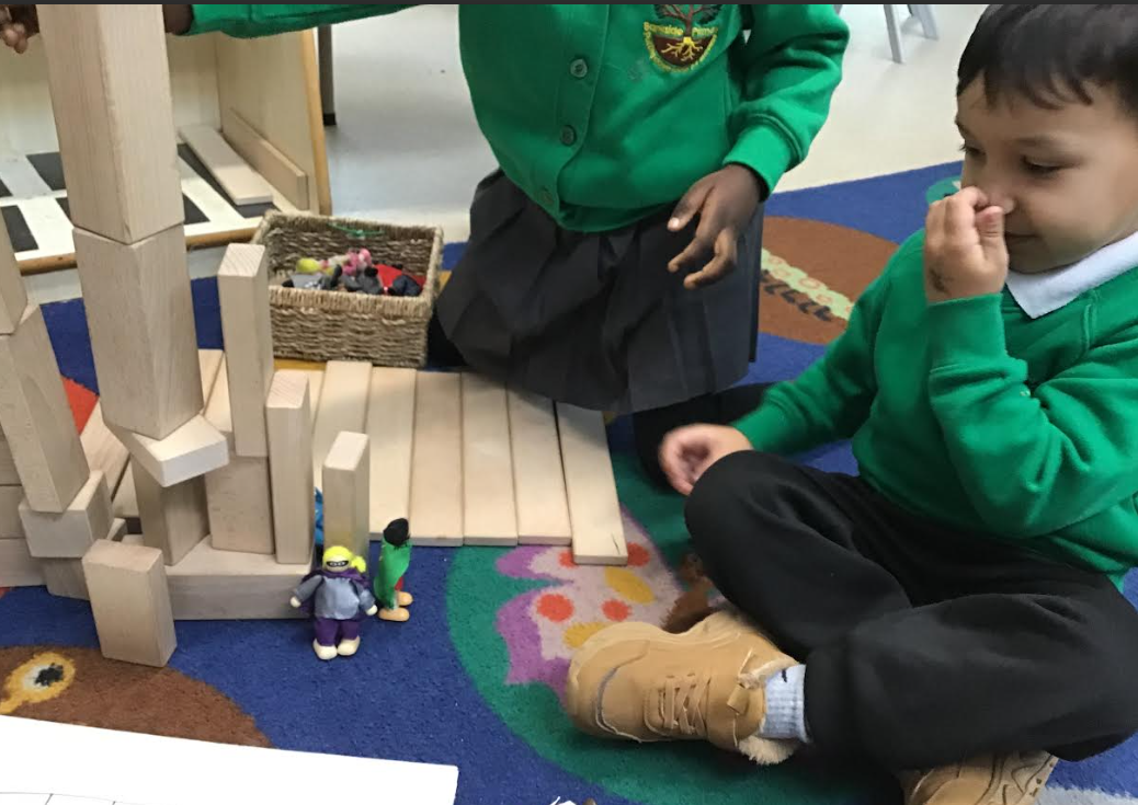 Practitioners in reception have observed that the children's small world block play is very limited. We decided to introduce a word of the week 'escape' to the children and model how to bring that into a simple 3 step story. The children adored bringing this into their play, using superheroes to 'rescue' the small world people from their 'tall' buildings from which they 'escaped'. Teachers scribed the children's stories as they became more confident in their mini stories, showing children how marks have meaning and showing them pride in their stories.