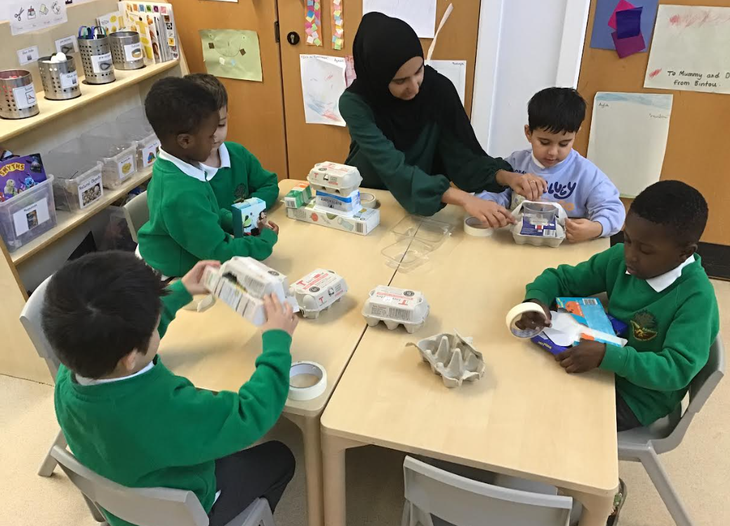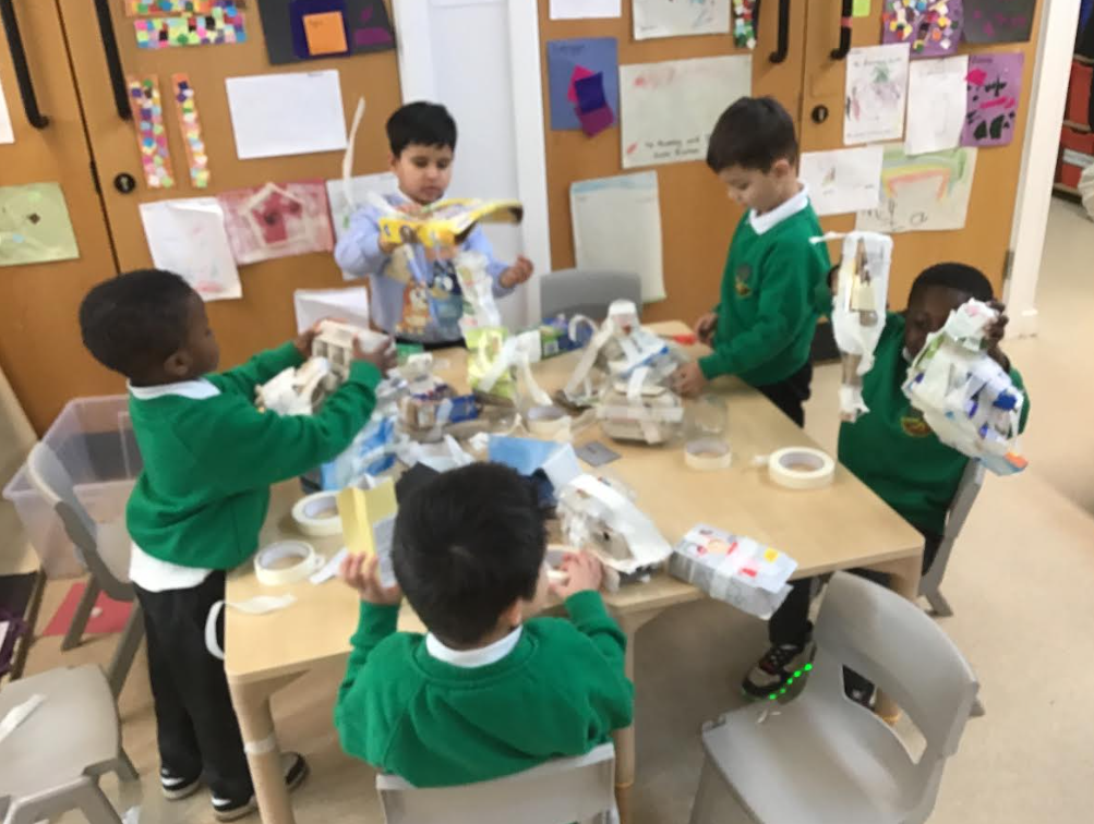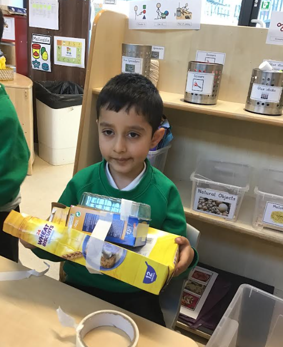 This week our skill in EAD has been to combine boxes using joining techniques that we have taught this term. The children used scissors, tape and glue to combine models into arrangements that they enjoyed making. Levels of involvement were extremely high as children adapted and changed their models as they designed. Children were very skillful in using the tape to attach the boxes but needed some support in using the appropriate amount of tape. Children were challenged to think what their model could represent and say one feature of their model, moving towards making evaluations in their future months with us. A great learning journey everyone!