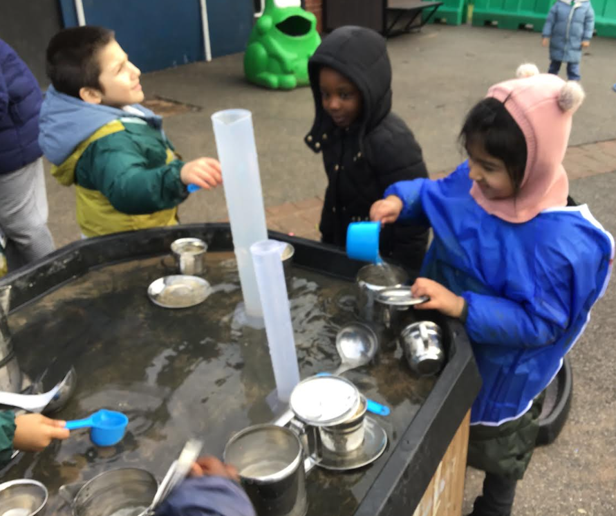 Messy play has given us many opportunities for interactions around maths this week. Lots of children have been really interested in using the hose to fill large containers. Staff have used this opportunity to teach children about size, capacity and the tricky question of 'how much more?'. As this was done through the interests of children, children will retain this new learning and be able to apply it in other real life experiences.