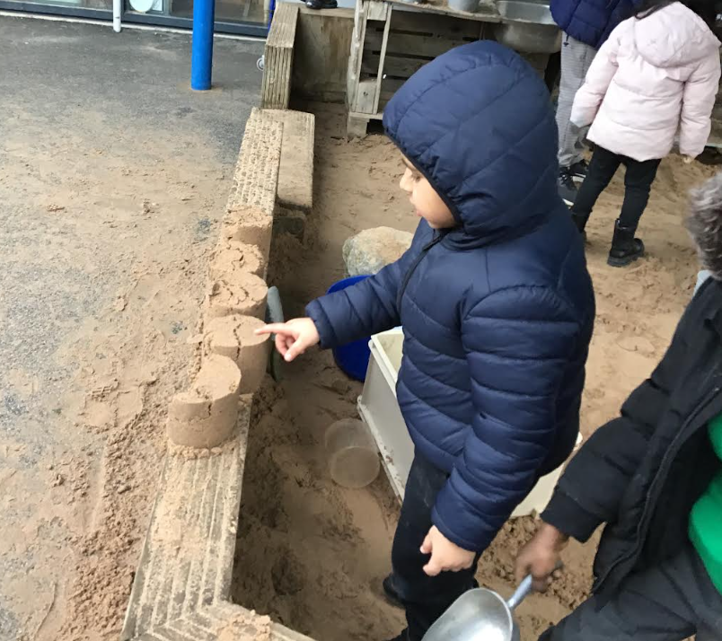 We have also ensured that our continuous provision offers lots of opportunities for children to start using number names in their play. This can be from lining up different natural objects or lining up sand sculptures made with the sand moulds. Adults spent time modelling the language of counting whilst children engage in these new experiences.