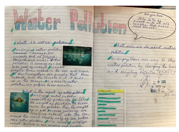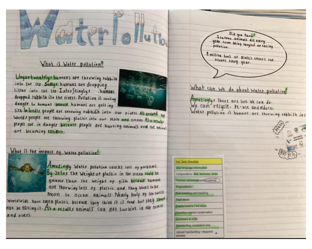 Green Base have spent this half-term immersed in writing about pollution. They have written a whole information page about the effects of water pollution on our earth. We have used fronted adverbials, prepositions, conjunctions and written concluding sentences. We are dedicated to ensuring that your child learns to use capital letters and full stops correctly and it becomes an automatic habit to give them the best start. The children are showing great pride in their finished pieces - as you can see!