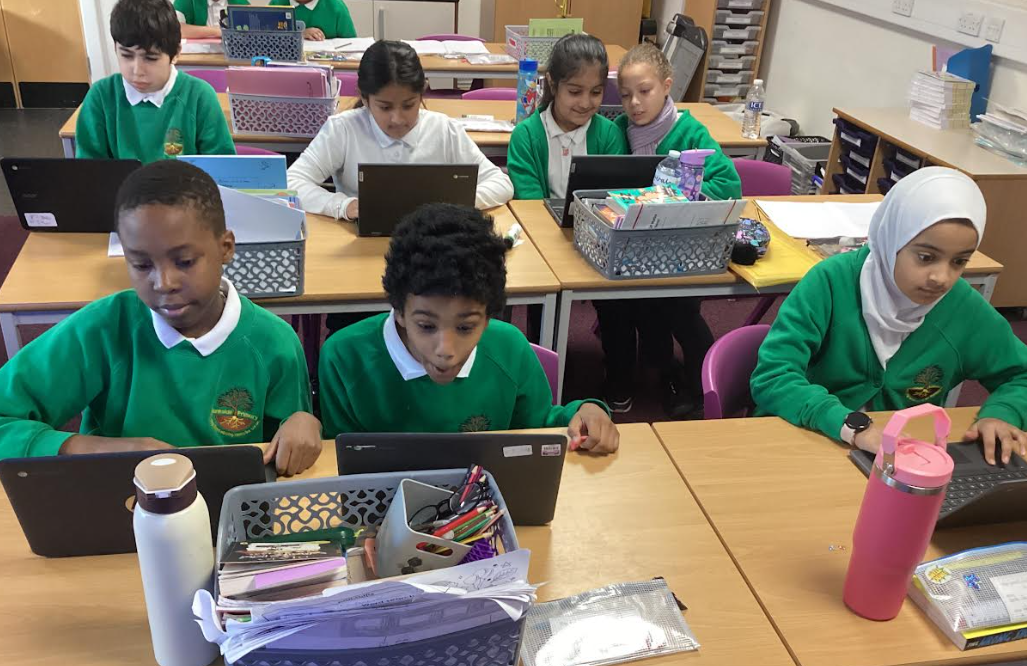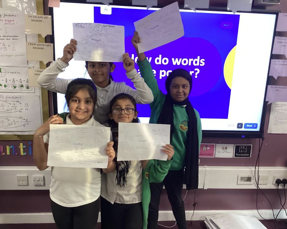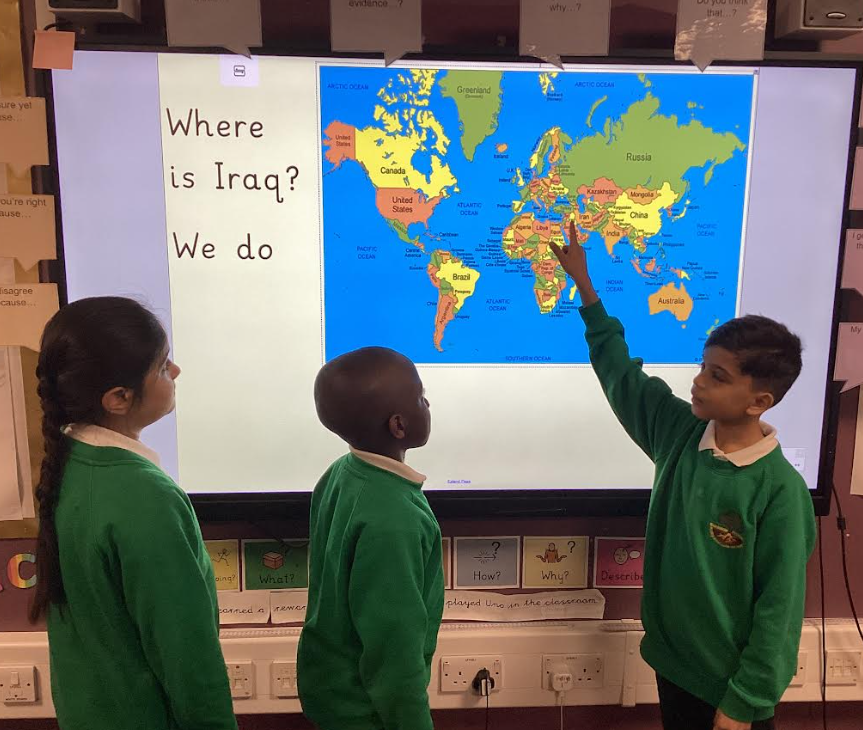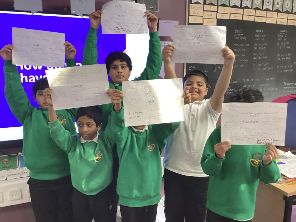 Indigo base photos are from a refugee workshop that we enjoyed with the British Library. We practised showing a variety of emotions in our faces and actions as freeze frames, learned how we could create a freeze frame of a scenario using different levels within the group (standing, crouching, sitting, etc) to make the frame more effective and realistic. Our freeze frames were based on the story of 'Azzizi in between' by Sarah Garland. This workshop helped to enhance our empathy with refugees and the horrific circumstances they often find themselves in. This links really well with our English learning this term where we have written a persuasive letter to the prime minister in support of refugees and we are planning to write a journey tale about refugees. All our work in class has been focussed on our reading of a novel 'The Boy at the Back of the Class' by Onjali Q Rauf, which tells the story of a refugee called Ahmet, which the children are thoroughly engrossed in.