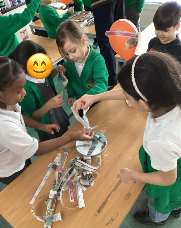 We have been learning all about Jeff Koons, he creates large shiny sculptures! We love his tulip sculpture and decided to create our own. We blew up balloons, mixed PVA glue and water and then put this mixture onto the balloons to create a hard shell. When it had set we popped the balloon inside, carefully pulled it out of the hole at the bottom and used glittery paint to make it shine, just like Jeff Koons!