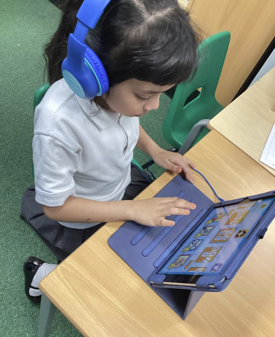 Some of the children in Green Base have been using the iPads to improve their reading skills. They independently access the initial code app and play the games to support their growing skills.