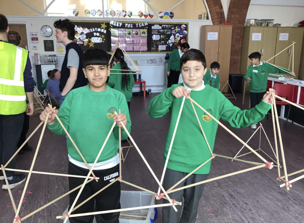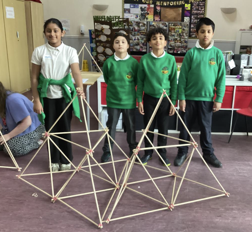 The afternoon was based around structural engineering where we looked at different pyramid structures of buildings and found out the benefits of this structure shape. We then participated in a 'tetrahedron workshop'. By carefully following instructions, every child built at least one pyramid, using only 6 sticks and four elastic bands. They showed resilience when building and collaborated well with each other when working in teams. We then built up the pyramids by putting four pyramids together to make a bigger one and eventually we made a huge pyramid consisting of four sections of four pyramids.