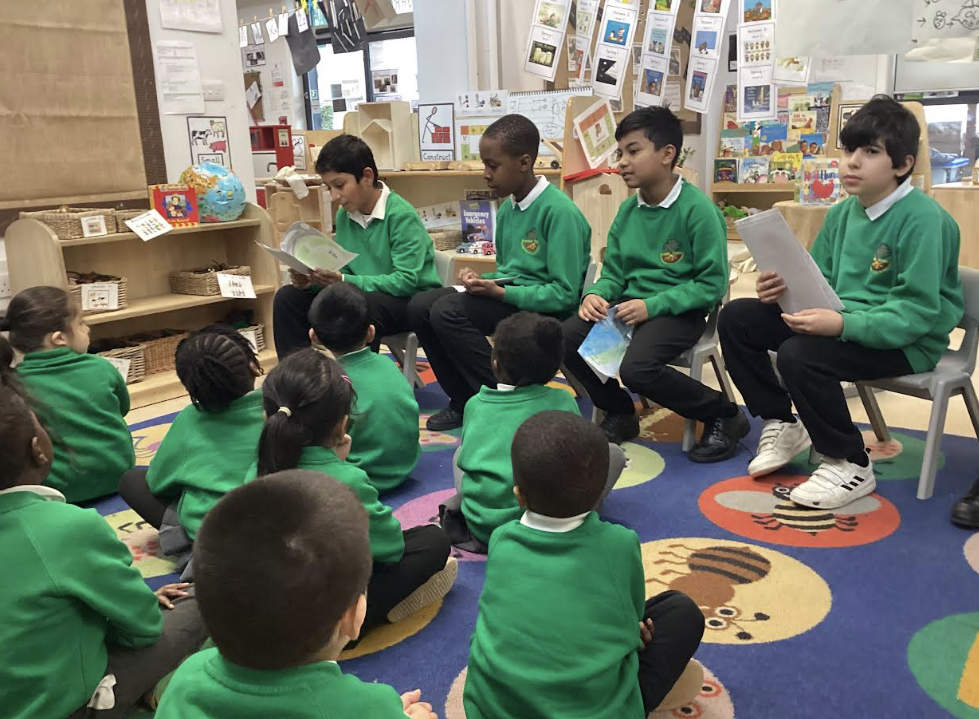 A group of year 5 children went to visit reception to read their stories to the younger children. They shared the books that they had created, and read out the stories that they had written based on 1001 Arabian Nights tales. It was a lovely experience for all, the year 5s were excited to show their work and the younger children were a fabulous audience, who listened intently.